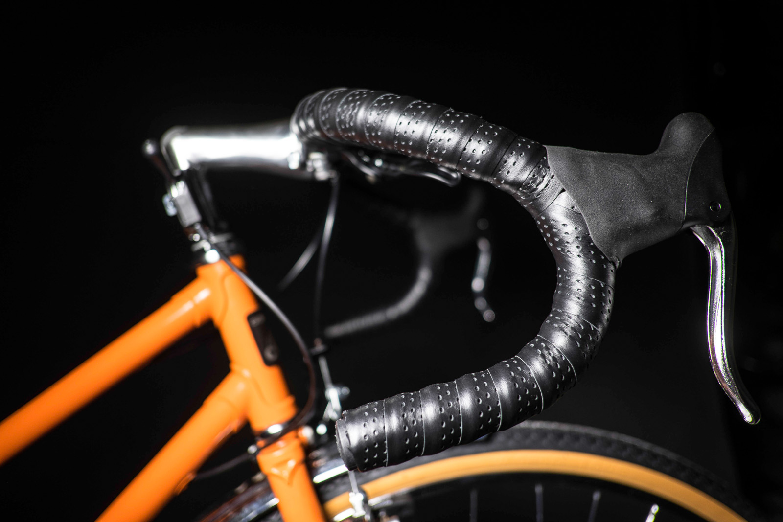 Kämpferisches Fahrrad im Rennstil mit Unisex-Rahmen, lederverkleideter Lenker, verchromte Kettenkasten und Schutzbleche.